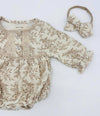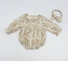 The Elodie romper blends timeless charm with vintage-inspired elegance, thoughtfully crafted from triple-layered 100% cotton muslin for exceptional softness and breathability. Featuring a neutral floral print, delicate lace trim, functional front buttons, and convenient snap closures for easy diaper changes, it offers both beauty and practicality. Ideal for spring, summer, or fall, the romper includes a matching bow.